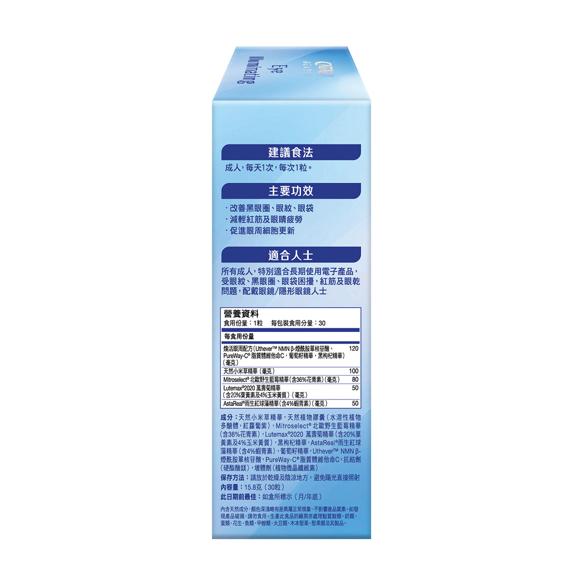 Natural Eyebright Extract, Natural Plant Capsule (Water Soluble Plant Polysaccharides, Red Carrot Purple), Mitoselect® European Bilberry Fruit Extract (36% Anthocyanins), Lutemax®2020 Marigold Extract (20% Lutein and 4% Zeaxanthin), Black Goji Extract, AstaReal® Algae Extract (4% Astaxanthin), Grape Seed Extract, Uthever™ NMN β-Nicotinamide Mononucleotide, PureWay-C® Liposomal Vitamin C, Anticaking Agent (Magnesium Stearate), Bulking Agent (Plant Microcrystalline Cellulose)