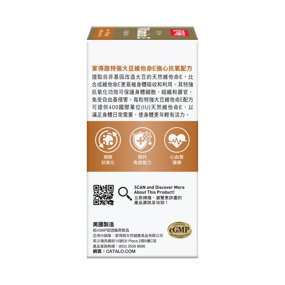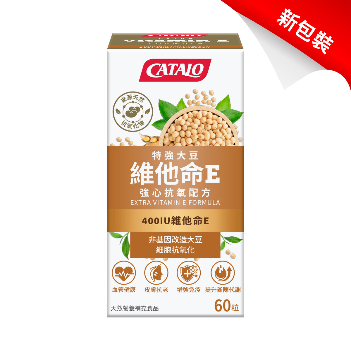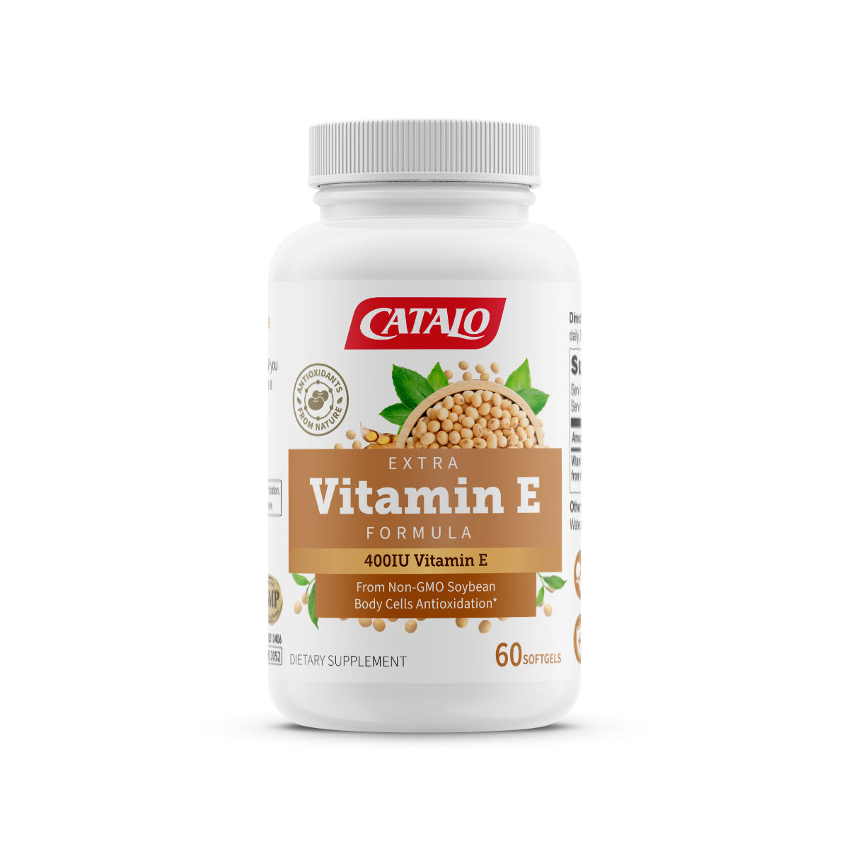 CATALO Extra Vitamin E Formula a natural Vitamin E sourced from non-GMO soybeans. Our formula provides better absorption and utilization compared to synthetic Vitamin E. Experience the exceptional antioxidant power it delivers, free from the detrimental effects of free radicals. This formula has been shown to effectively protect fatigued skin, minimizing the appearance of aging. Improved skin hydration, reduced wrinkles, and support skin elasticity. Additionally, Vitamin E plays a crucial role in supporting immune health, promoting blood vessel elasticity, and maintaining cardiovascular well-being. With just one softgel, you can fulfill your daily requirement with 400 IU of natural Vitamin E.