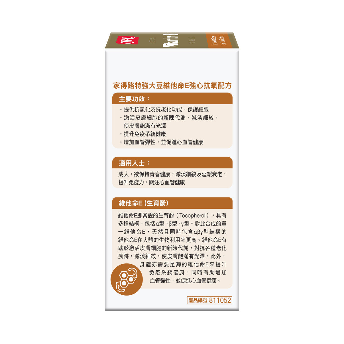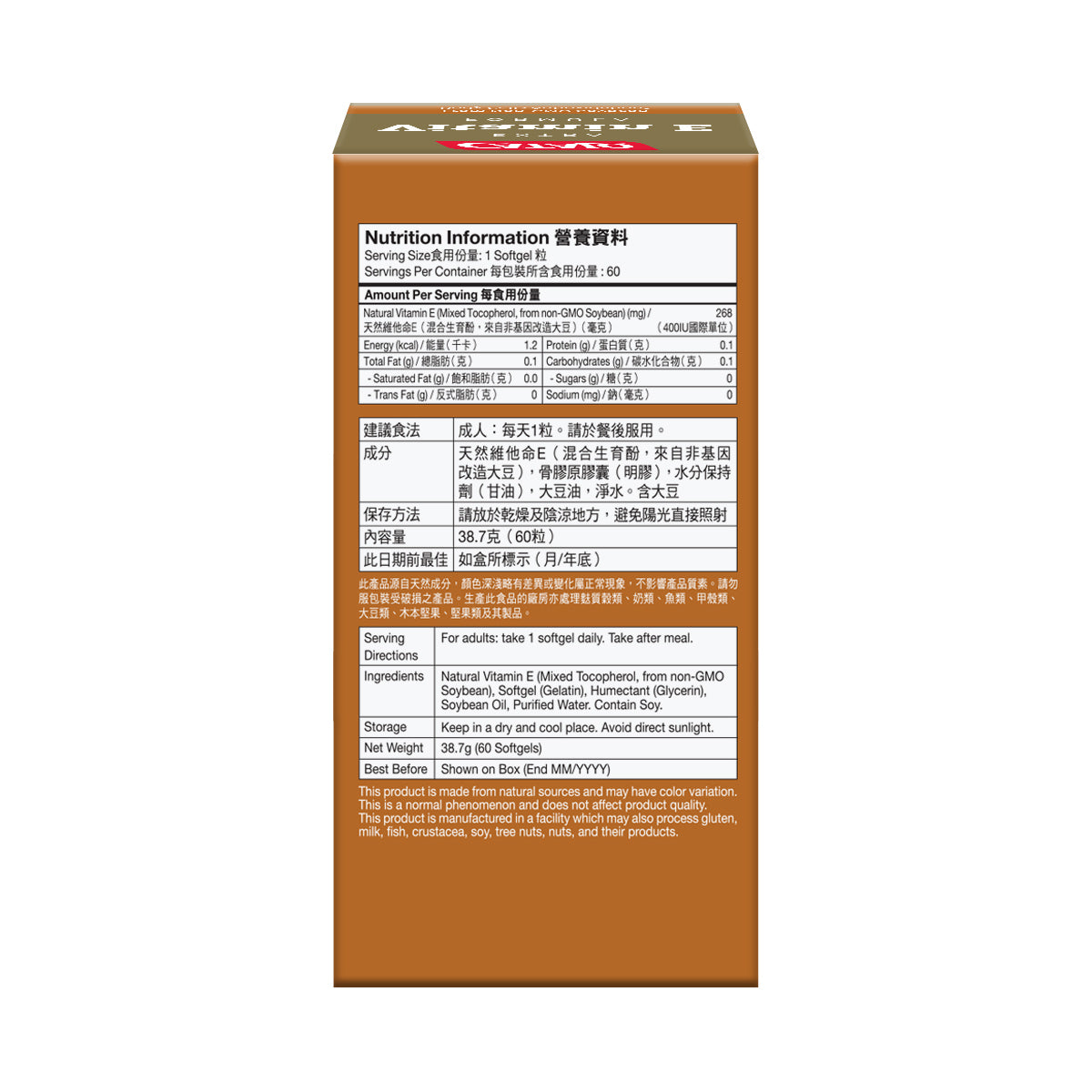 Natural Vitamin E (Mixed Tocopherol, from non-GMO Soybean), Softgel (Gelatin), Humectant (Glycerin), Soybean Oil, Purified Water. Contain Soy.