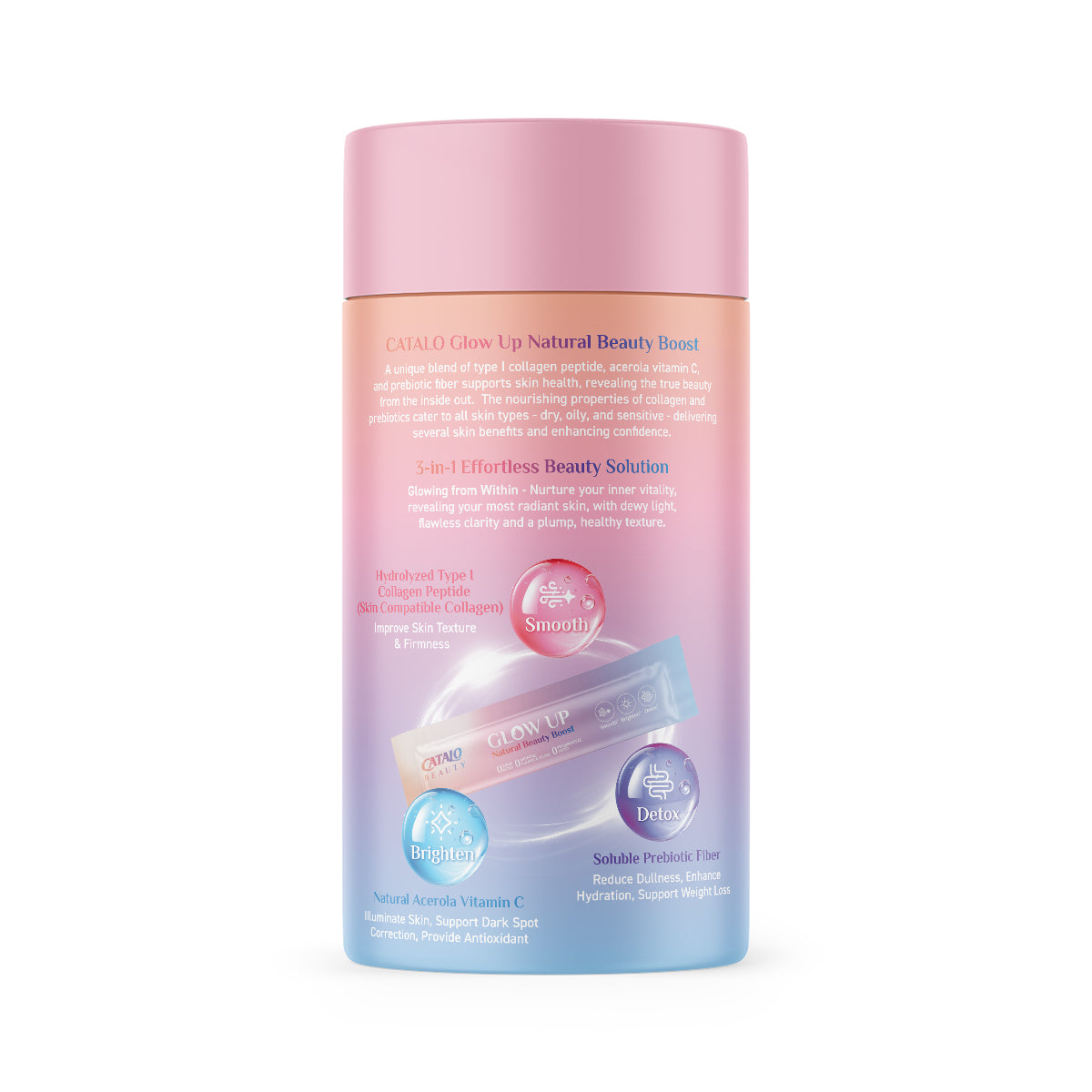 Catalo Glow Up Natural Beauty Boost contains hydrolyzed small-molecule Type Ⅰ collagen, which is highly absorbable. It promotes collagen regeneration, reduces fine lines and enhances skin elasticity. Formulated with acerola cherry extract rich in vitamin C, it delivers antioxidant benefits, further supports collagen regeneration and helps achieve a brighter, firmer complexion. Added prebiotics enhance intestinal peristalsis to eliminate toxins and improve dull skin tone. Adhering to a natural and additive-free standard, the formula contains no artificial additives or added sugar, making it low-calorie and non-burdensome for daily intake.