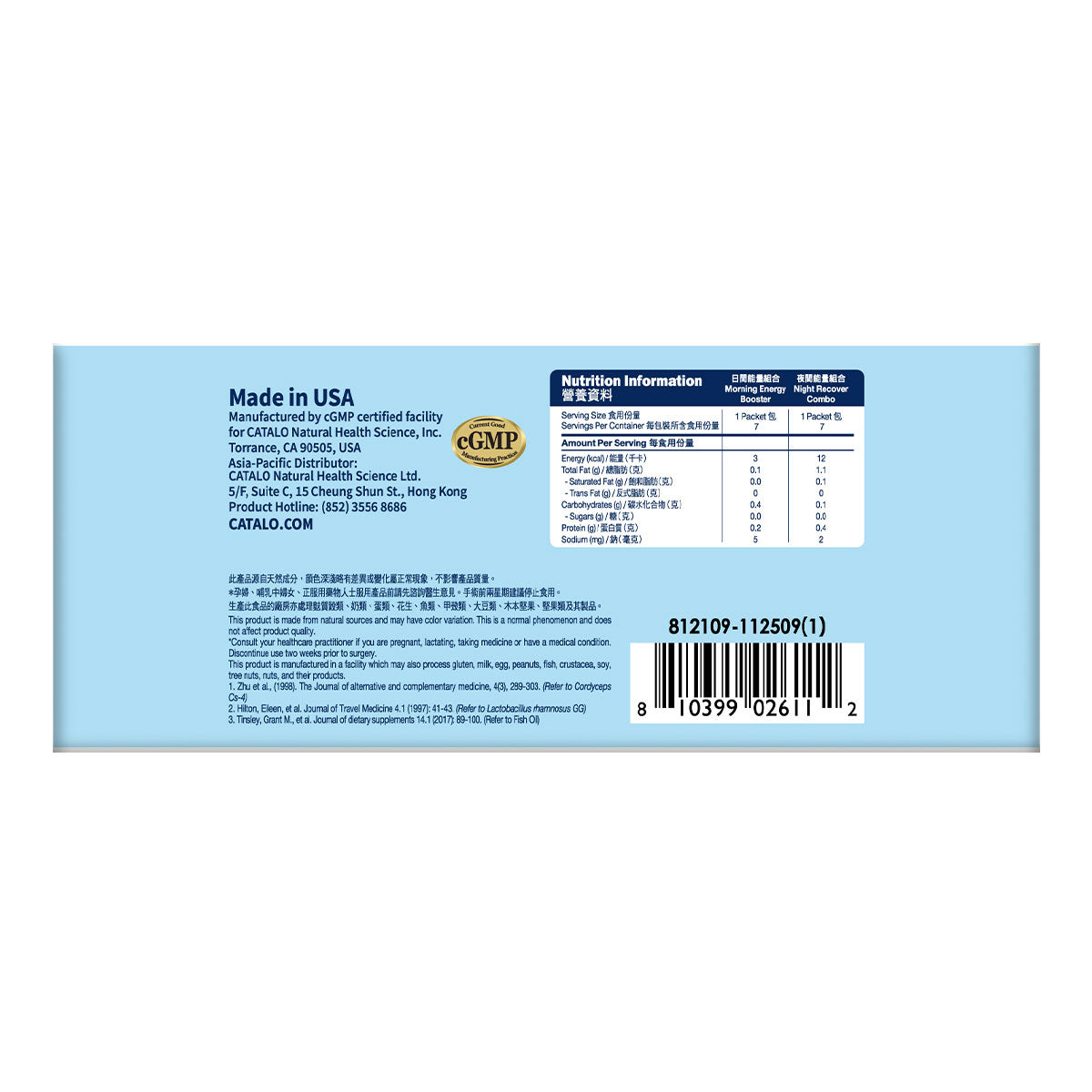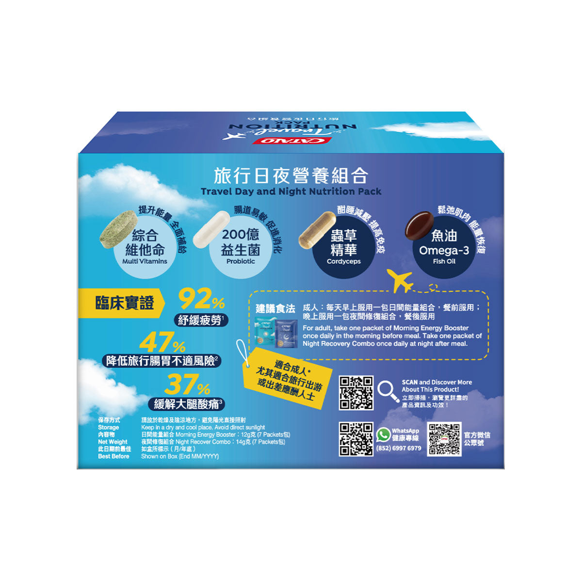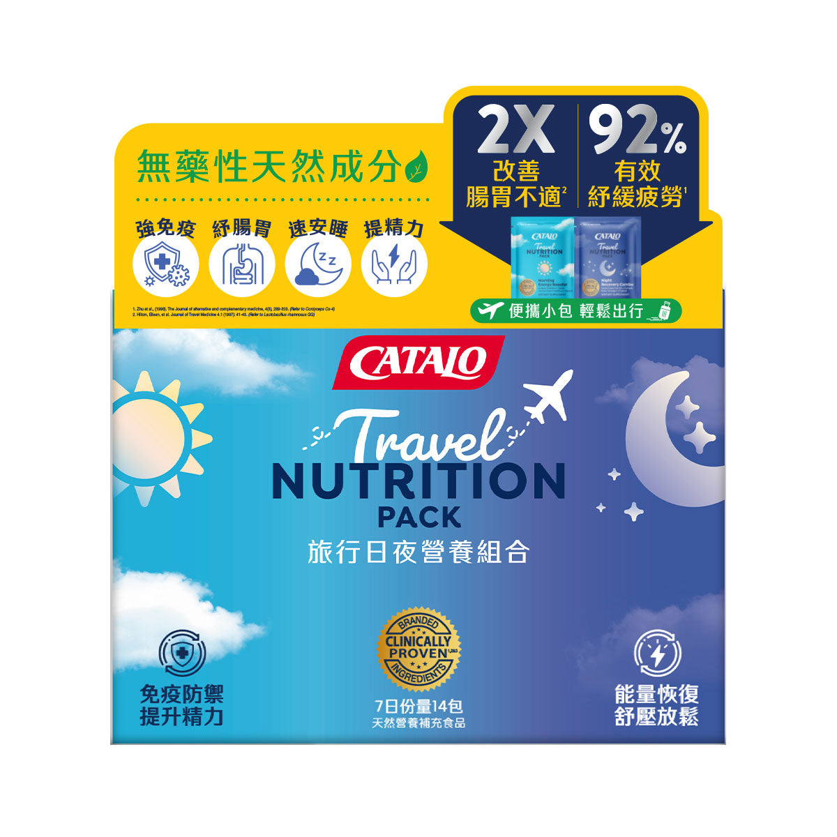 CATALO Travel Day & Night Nutrition Pack is specially designed for travelers. It features a comprehensive multivitamin, 20 billion probiotics, high-concentration fish oil, and stress-relieving cordyceps extract to deliver essential daily nutrients. Formulated for travel needs, it is clinically proven to promote restful sleep, alleviate fatigue, and reduce muscle soreness. It can also comprehensively boosts immunity, effectively reducing the risk of travel-related gastrointestinal discomfort by nearly 50%. Featuring convenient individual packets with a dedicated day and night combo, it delivers round-the-clock nutritional support throughout your journey.