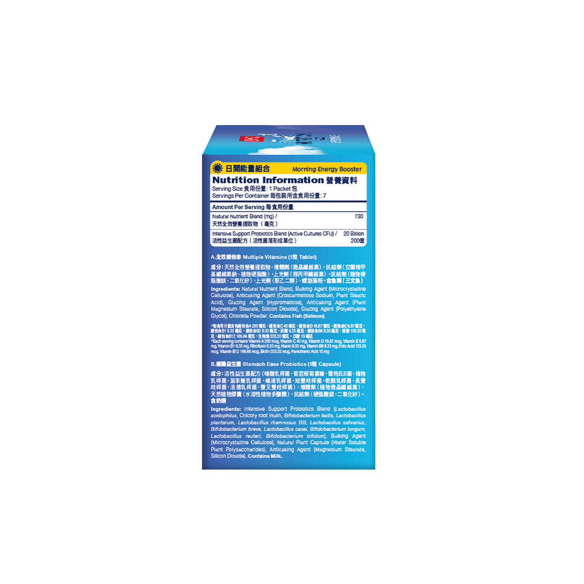 Ingredients: Intensive Support Probiotics Blend (Lactobacillus acidophilus, Chicory root inulin, Bifidobacterium lactis, Lactobacillus plantarum, Lactobacillus rhamnosus GG, Lactobacillus salivarius, Bifidobacterium breve, Lactobacillus casei, Bifidobacterium longum, Lactobacillus reuteri, Bifidobacterium bifidum), Bulking Agent (Microcrystalline Cellulose), Natural Plant Capsule (Water Soluble Plant Polysaccharides), Anticaking Agent (Magnesium Stearate, Silicon Dioxide). Contains Milk.