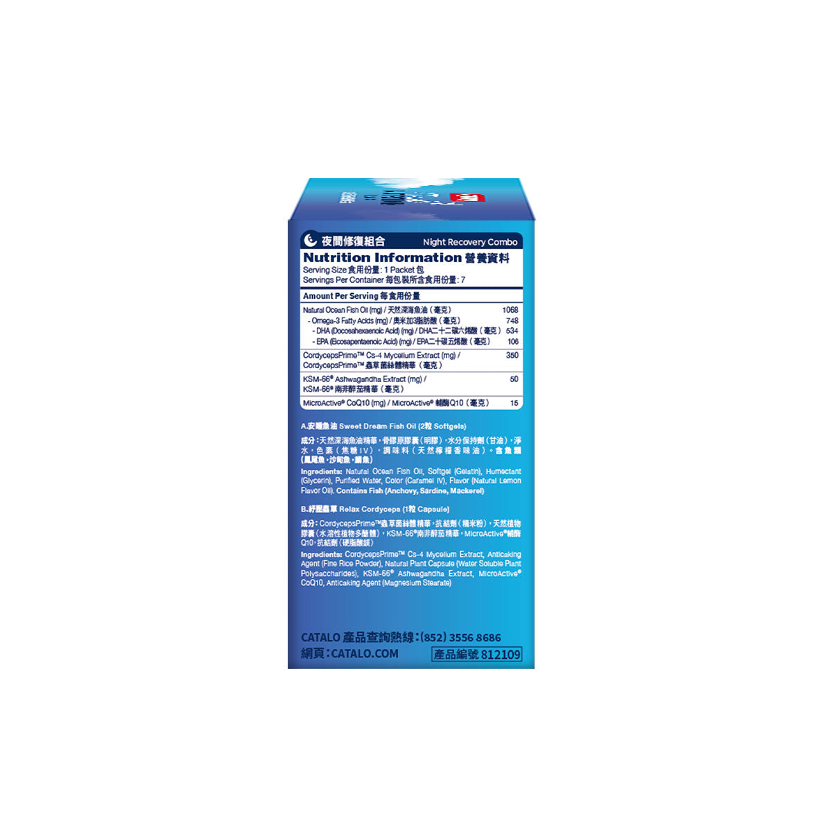 Ingredients: CordycepsPrime™ Cs-4 Mycelium Extract, Anticaking Agent (Fine Rice Powder), Natural Plant Capsule (Water Soluble Plant PolySaccharides), KSM-66 Ashwagandha Extract, MicroActive® CoQ10, Anticaking Agent (Magnesium Stearate)