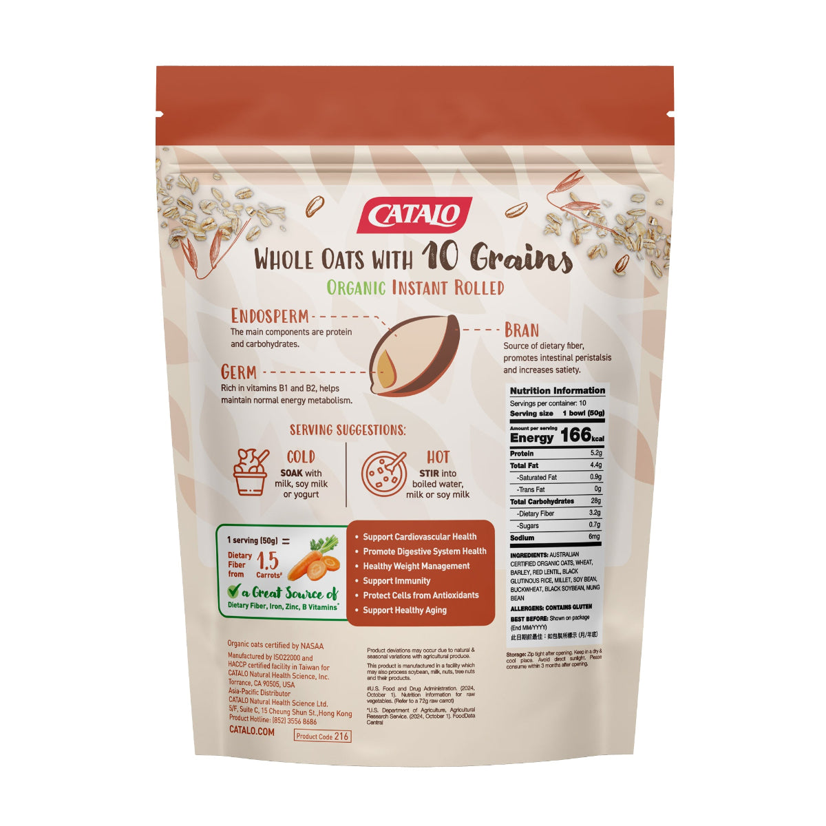除选用澳洲优质有机燕麦外,配合其他九种精选谷物 - 小麦、大麦、小米、黄豆、黑豆、荞麦、红扁豆、绿豆 及黑糯米,营养全面;采用特别技术,制熟过程保留燕麦片及榖片的完整性,而且含丰富水溶性纤维,有助降低胆固醇及促进心脏血管健康。此产品无添加防腐剂及添加剂。