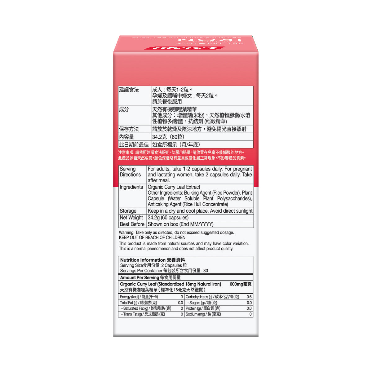 家得路天然铁配方 特选获有机认证无污染种植的新鲜咖哩叶,经高科技制成高浓缩咖哩叶精华,含丰富高活性的天然铁质,易被人体吸收,并不会刺激肠胃及对身体造成负担。女士生理周期期间、经常饮用浓茶及咖啡人士或素食者都较容易出现缺铁情况,并会容易疲倦、手脚冰冷等问题,补充足够铁质有助保持补充血气,促进血液循环,时刻面色红润,精神奕奕。配合特选植物胶囊,适合素食人士。