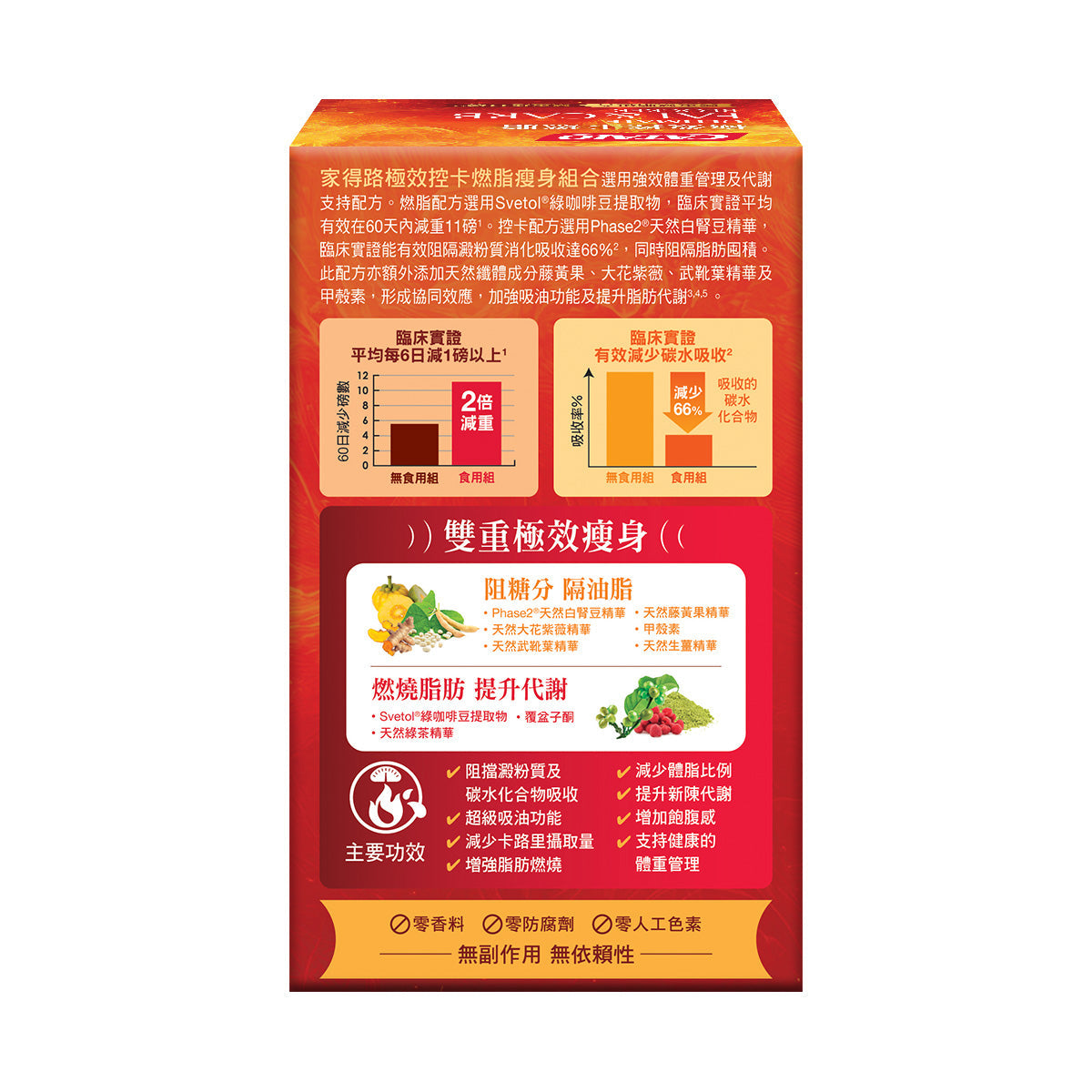 家得路極效控卡燃脂瘦身組合選用強效體重管理及代謝支持配方。燃脂配方選用Svetol®綠咖啡豆提取物,臨床實證平均有效在60天內減重11磅¹。控卡配方選用Phase2®天然白腎豆精華,臨床實證能有效阻隔澱粉質消化吸收達66%²,同時阻隔脂肪吸收。此配方亦額外添加天然纖體成分:藤黃果、大花紫薇、武靴葉精華及甲殼素,形成協同效應,加強吸油功能及提升脂肪代謝³ ⁴ ⁵。