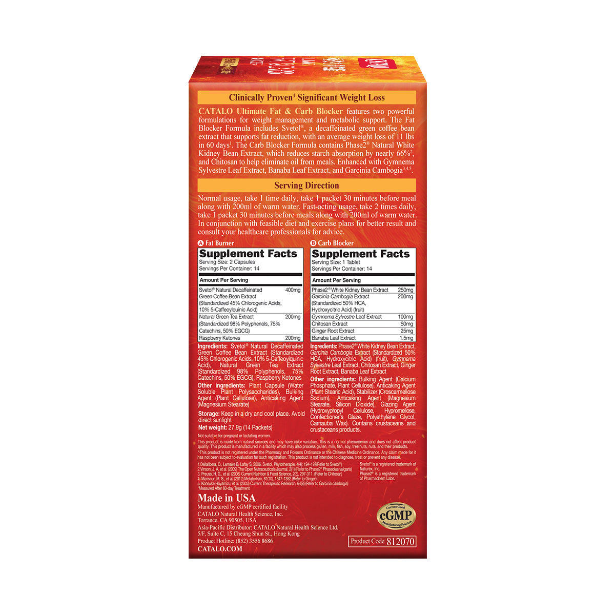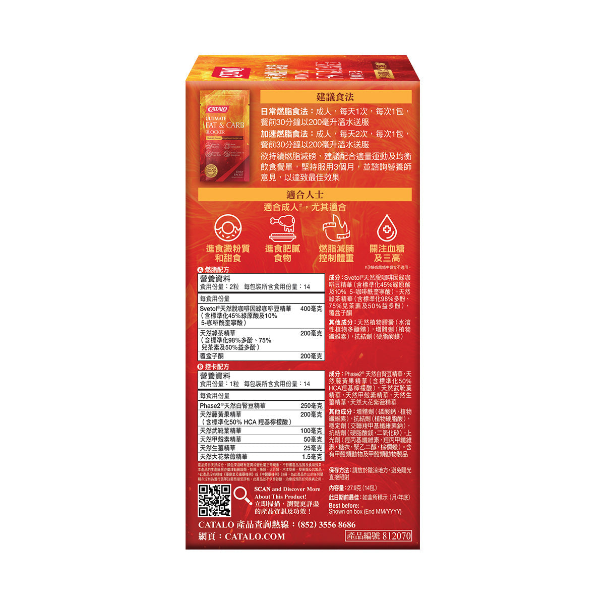 成分:Phase2®天然白腎豆精華、天然藤黃果精華(含標準化50% HCA羥基檸檬酸)、天然武靴葉精華、天然甲殼素精華、天然生薑精華、天然大花紫薇精華。其他成分:增體劑(磷酸鈣,植物纖維素)、抗結劑(植物硬脂酸)、穩定劑(交聯羧甲基纖維素鈉)、抗結劑(硬脂酸鎂,二氧化碳)、上光劑(經丙基纖維素,經丙甲纖維素,糖衣,聚乙二醇,棕櫚蠟)含有甲殼類動物及甲殼類動物製品