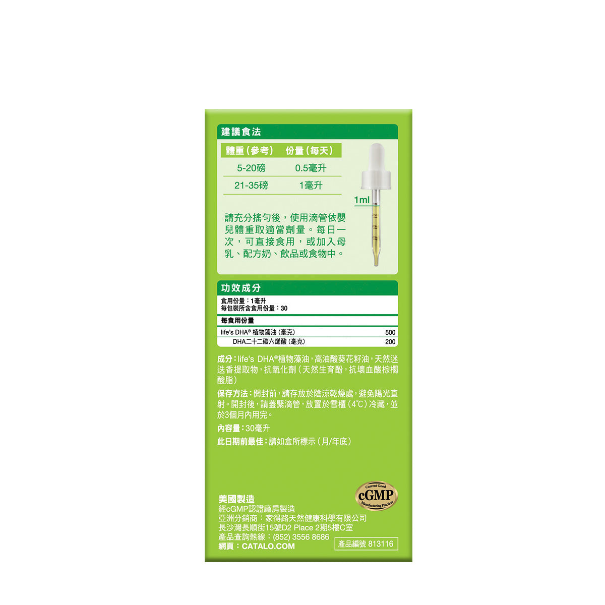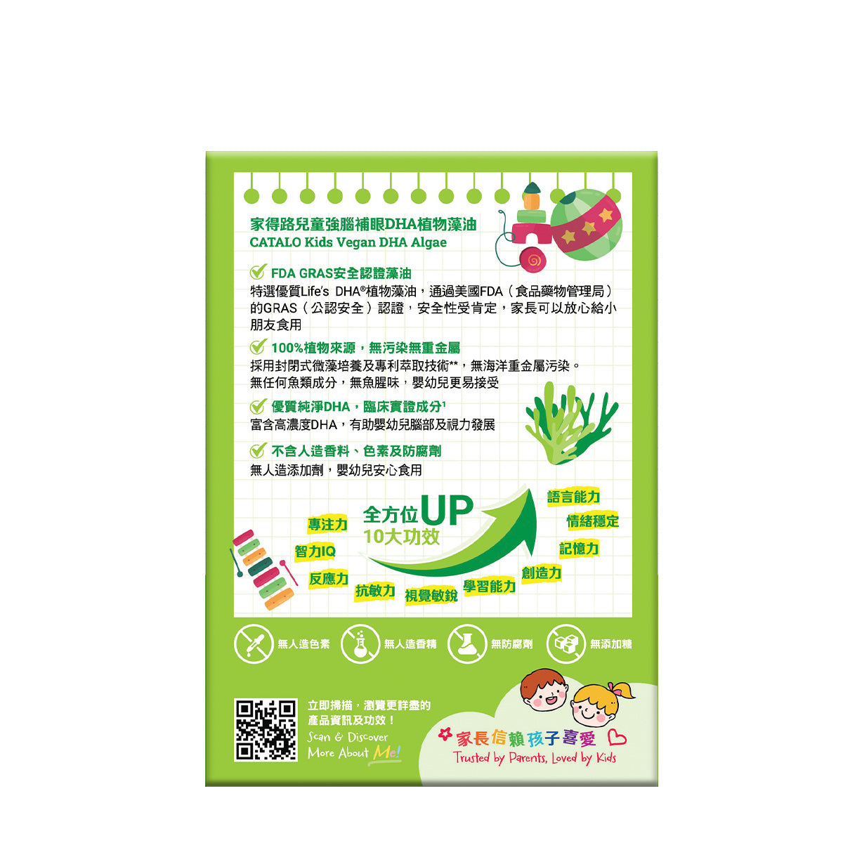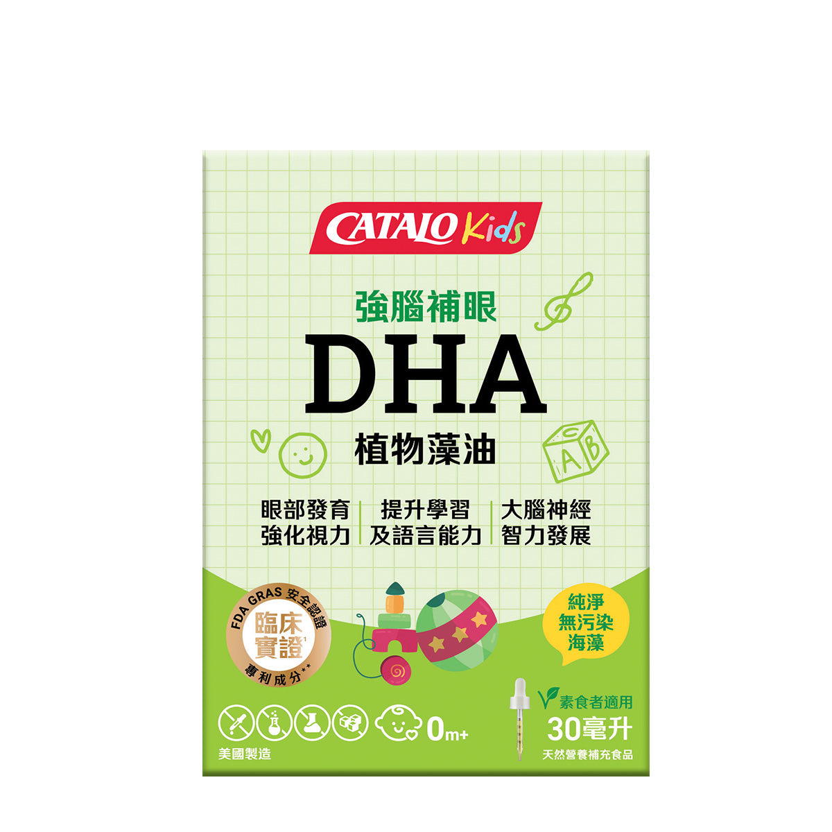 用封閉式微藻培養及專利萃取技術,無海洋重金屬污染。無任何魚類成分,無魚腥味,嬰幼兒更易接受